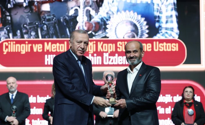 Şahin, Safranbolu'nun Demirciler Loncası'nda yaklaşık yarım asırdır ahilik kültürüne bağlı kalarak geleneksel metal işçiliği ve kapı süsleme sanatını icra eden Özdemir'in, Cumhurbaşkanı Erdoğan'ın elinden "Yaşayan İnsan Hazineleri" ödülünü aldığını bildirdi.