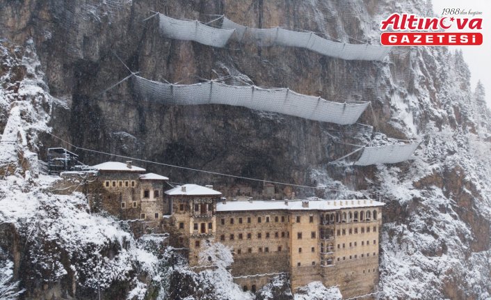 Karadağ'ın Altındere Vadisi'ne bakan eteğinde, vadiden yaklaşık 300 metre yükseklikteki ormanlık alanda kayalar oyularak yapılmış ve halk arasında "Meryem Ana" adıyla bilinen Sümela Manastırı da etkili yağışın ardından beyaza büründü.