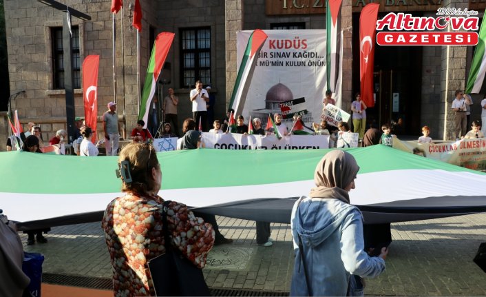 İlçedeki İskenderpaşa Camisi önünde bir araya gelen Özgür Aksa Trabzon Platformu üyeleri, ellerinde Türk ve Filistin bayraklarıyla slogan atarak Kahramanmaraş Caddesi'ndeki Ziraat Bankasının önüne yürüdü.