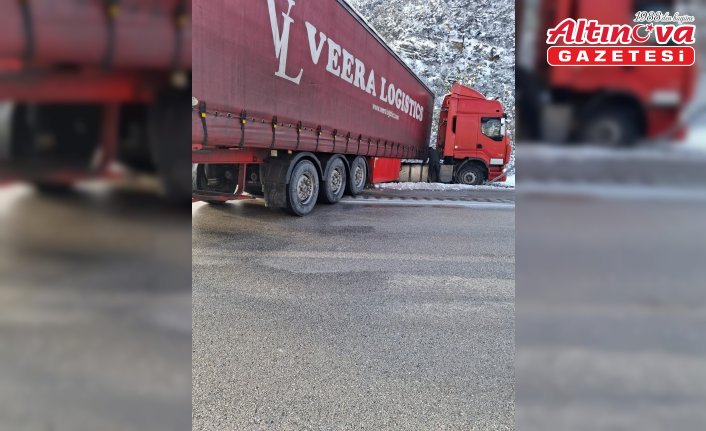 İhbar üzerine olay yerine sevk edilen İl Özel İdaresi ekipleri yolda kalan tırı kurtardı.   TOKAT (AA)