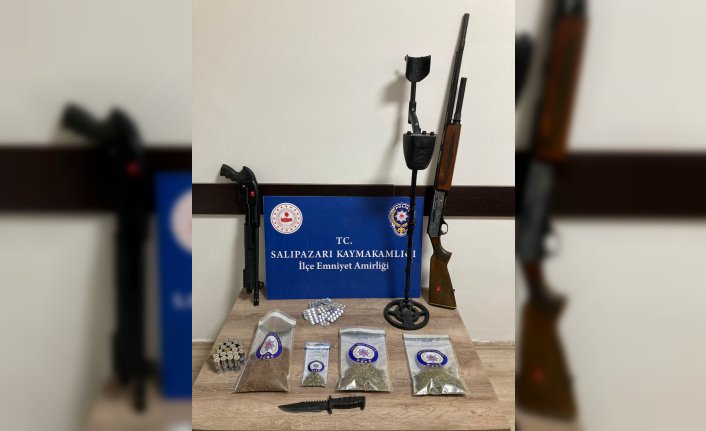 Zanlının ev ve eklentilerinde yapılan aramalarda 76 gram esrar, 230 gram esrarlı tütün, 57 reçeteye tabi sentetik ecza hapı, ruhsatsız av tüfeği, ruhsatsız pompalı tüfek, 23 tüfek kartuşu, kasatura ve detektör ele geçirildi.