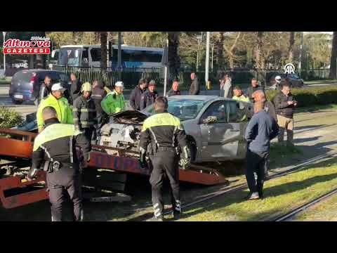 Samsun'da devrilen otomobil, tramvay seferlerini aksattı