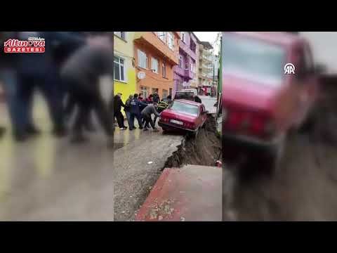 Samsun'da sokakta toprak kayması sonucu yolun bir bölümü çöktü