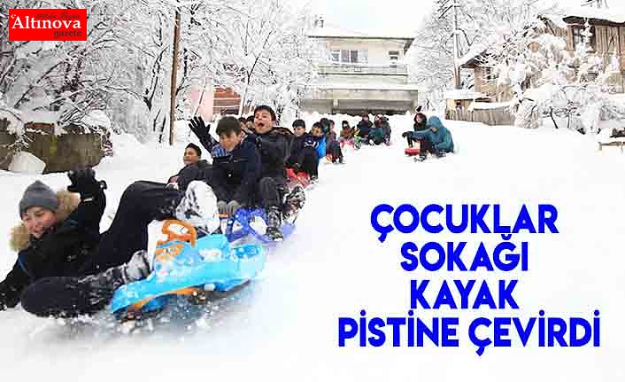 Bazı köylerde taşımalı eğitime ara verilen ilçede kar yağışını fırsat bilen çocuklar, cadde ve sokakları adeta kayak pistine döndürdü.