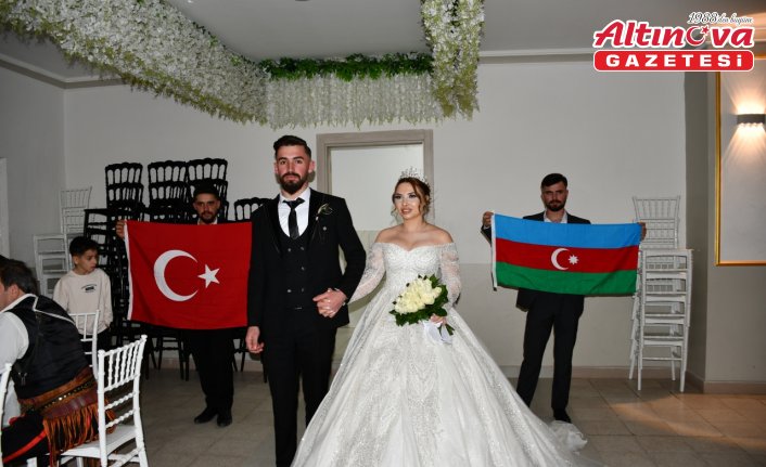 Türk ve Azerbaycan bayraklarıyla düğün salonuna giren çift, davetliler tarafından alkışlandı.