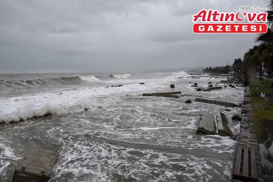 Adnan Menderes Bulvarı'ndaki sahildeki taşlar ve beton bariyerler, dalgaların etkisiyle yürüyüş ve bisiklet yolunu kapattı. Belediye ekipleri, bölgede şerit çekerek güvenlik önlemi aldı.