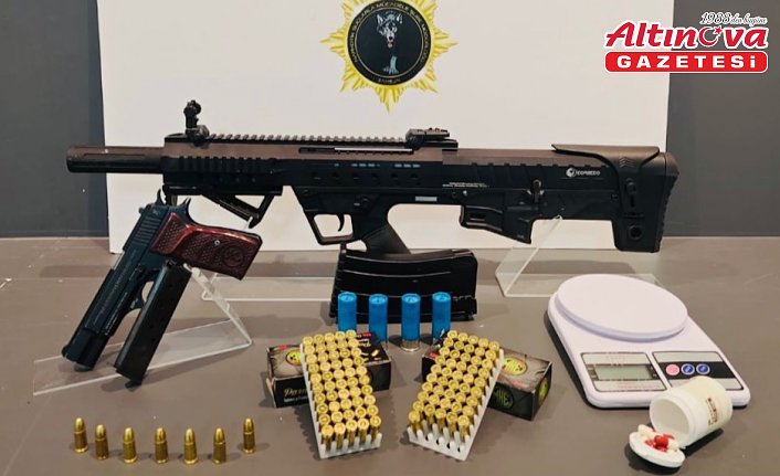 İkamette yapılan aramada ruhsatsız tabanca, ruhsatsız tüfek, 108 tabanca fişeği, 4 tüfek kartuşu, hassas terazi ve 7 sentetik ecza hapı ele geçirildi.