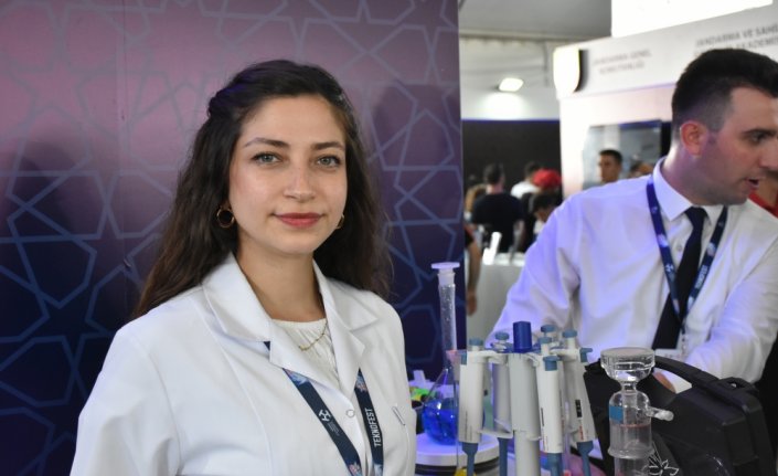 TEKNOFEST'teki İçişleri Bakanlığı standında sergilenen uyuşturucu madde profilleme sistemi, katılımcılara anlatılıyor.