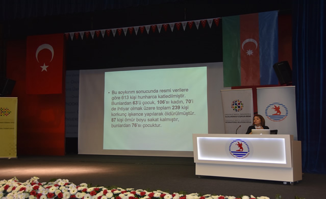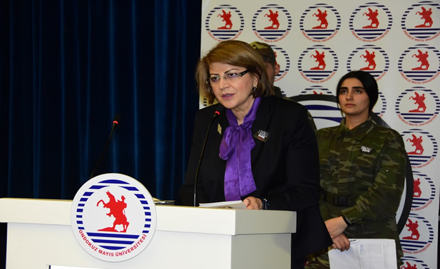 Daha sonra söz alan Azerbaycan Ankara Büyükelçiliği Eğitim Müşaviri Doç. Dr. Necibe Nesibova ise “26 Şubat 1992 yılı Azerbaycan’ın kadim Türk toprağı olan Karabağ’ın Hocalı kentinde, Ermeniler tarafından yapılan katliamın ve şehitlerin 27’nci yıldönümünün anma toplantısına geldiğiniz için sizlere teşekkür ederim. Ayrıca halkımızın yaşadığı bu acıyı bizimle paylaştığı ve bu törene ev sahipliği yaptığı için Ondokuz Mayıs Üniversitesi’ne, temsil ettiğim Bakanlık ve Büyükelçilik adına ve saygılarımı sunarım. Türkiye ve Azerbaycan’ın bulunduğu coğrafya acılarla yoğrulmuş bir coğrafyadır. Bu coğrafyada pek çok acılar yaşandı, bu acıların belki de en büyüğü Hocalı Katliamı’dır. Hocalı, Ermeni milliyetçilerinin yüzyıllar boyunca Türk ve Azerbaycan halklarına karşı yaptığı soykırım ve etnik temizleme siyasetinin en kanlı sayfasıdır. Kendi acımasızlığına ve şiddetine göre ise insanlığa karşı işlenen büyük bir suçtur. Hocalı, bir kentin yeryüzünden silinmesi, içinde yaşayan kadın, çocuk, genç, yaşlı demeden topyekün saldırıya uğraması, kaçabilenlerin de soğuk ve karlı dağlarda ya donarak hayatını kaybetmesi ya da sakat kalması, kaçamayanların ağır silahlarla taranması, anlatılması ve anlaşılması son derece zor bir vahşet.” ifadelerini kullandı.
