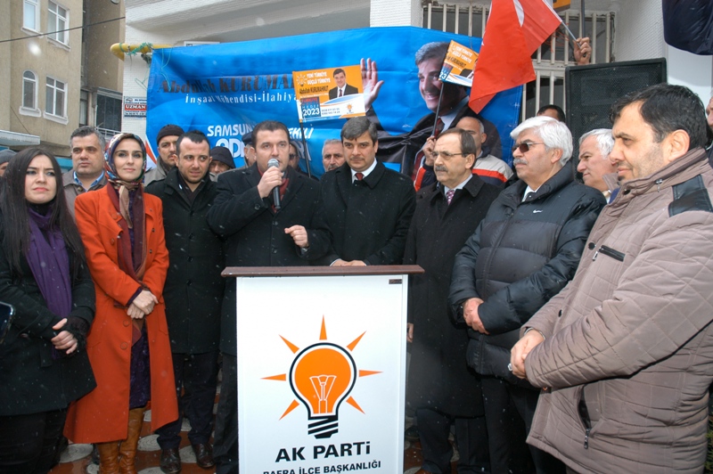 AK Parti Samsun Milletvekili aday adayı işadamı Abdullah Kurumahmutoğlu vatandaşlara hitaben yaptığı konuşmada," Değerli dostlarım, İnşaat Mühendisiyim, ilahiyatçıyım, çocukluğumuzdan bu günümüze kadar, ilkokul birinci sınıftan çıkınca sağ olsun babam derdi, “İş yerine gel” ve okuldan çıktıktan sonra iş yerine geçerdik. Yani çocukluğumuzdan bu güne kadar ticaretle uğraştık. Esnaf olduk, sosyal ilişkiler kurduk, dostluklar kurduk, adamlığı öğrendik. Başta babamdan ve bütün ilişki kurduğum dostlarımızdan Allah razı olsun, bizleri sizler yetiştirdiniz sağ olun varolun. Değerli dostlarım gençliğimiz, maalesef ben gençliğimden bugüne kadar Bafra ve bölgesinde çok kişinin işe girmesine vesile oldum. Gerçekten işe muhtaç olan çok kardeşlerim var. İnşallah bundan sonrada sizlerin bana vereceği destekle çok daha kardeşimizin iş imkanı bulmasına vesile olacağıma inanıyorum. Bu konuda çok ciddi çalışmalarımız var. Gerek yerel, gerekse ulusal ve uluslararası alanda çalışmalarımız var. Bunlar devletin zirvesine kadar çıkmış çalışmalardır. Bunu da hatırlatayım, sayın Cumhurbaşkanımıza bu çalışma ve projeleri bizzat sundum. 30 dakika bire bir brifing vererek takdim ettim. İnşallah bu çalışma neticelendiği takdirde, inanın arkadaşlar çok uzak değil, 5 ya da, 10 sene içerisinde bu proje dünyada ikmal olduğu zaman Türkiye’de işsizlik bitecek. Türkiye’de dış ticaret açığı bitecek, enflasyon bitecek. Faizler sıfıra inecek. Her şeyden öncede Türkiye’de krizler devri tarihe karışacak. Kimse ne anayasa kitabı fırlatarak nede başka bir şekilde suni krizler oluşturarak Türkiye’nin önünü kesemeyecek. Çünkü artık tüketen Türkiye değil, üreten ve ürettiği ürünleri dünya'nın her tarafına satabilen Türkiye’yi göreceksiniz değerli arkadaşlarım, bunun altına imza atıyorum. Değerli arkadaşlar, 1990’lı yıllardı. Biraz önce bahsettiğim bu çalışmalarımızın Bafra ayağını sevgili babamın önderliğinde Bafra’mızın sulama projesi olan toplam 850 bin dönüm arazinin sulanabilirliğini sağlayan çok önemli ve sessizce ilerleyen çok ciddi proje hayat geçti. Buda şu demek senede, 3 defa ürün almak demek, biliyorsunuz Bafra’mız tarımı ile ünlü bir şehir. Dolayısıyla tarımsal sanayinin alt yapısı olan sulama projesi çok şükür babamın başkanlığında ve önderliğinde o günkü iktidarın desteğiyle hayat geçmiştir. Bugün çok şükür esnafımızın yüzü gülüyorsa, çok şükür işsizliğimize çare olmuşsa ve tarımsal sanayinin de alt yapısı olmuşsa bunu o günkü çalışmalara borçluyuz. Kendisinden Allah razı olsun" dedi.
