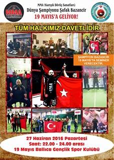MMA Kafes Dövüşü Dünya Şampiyonu Şafak Bazancir 19 Mayıs Ballıca Gençlik Spor Kulübü öncülüğünde 19 Mayıs`ta seminer verecek.