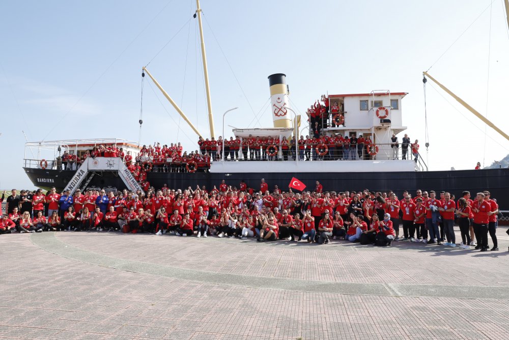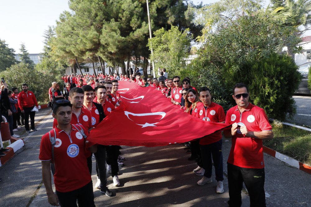 Ödül töreni için Nuri Asan Spor Tesisleri'nde toplanan sporcular 100 metrelik Türk bayrağı açarken protokol üyeleri de ellerindeki Türk bayraklarıyla Bandırma Müze Gemisi'ne kadar yürüdü.