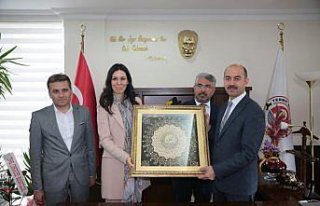 Ağaoğlu, ziyaret anısına Zorluoğlu'na plaket ve adının yazılı olduğu forma hediye etti.