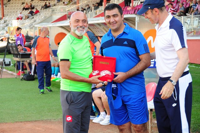 Teknik Direktör Ümit Özat da, Yeşil-Beyazlıların tecrübeli çalıştırıcısı Hikmet Karaman'a Samsunspor logolu kahve fincanı verdi.