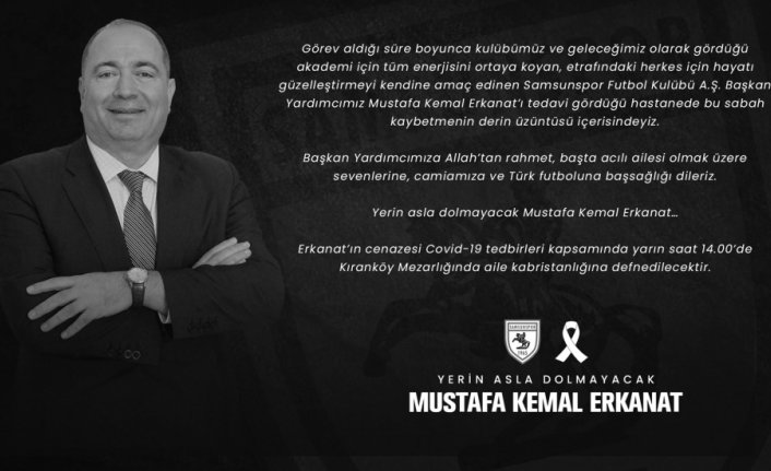 "Görev aldığı süre boyunca kulübümüz ve geleceğimiz olarak gördüğü akademi için tüm enerjisini ortaya koyan, etrafındaki herkes için hayatı güzelleştirmeyi kendine amaç edinen Samsunspor Futbol Kulübü AŞ Başkan Yardımcımız Mustafa Kemal Erkanat'ı tedavi gördüğü hastanede bu sabah kaybetmenin derin üzüntüsü içindeyiz. Başkan yardımcımıza Allah'tan rahmet, başta acılı ailesi olmak üzere sevenlerine, camiamıza ve Türk futboluna başsağlığı dileriz. Yerin asla dolmayacak Mustafa Kemal Erkanat."