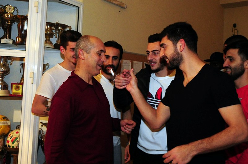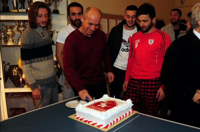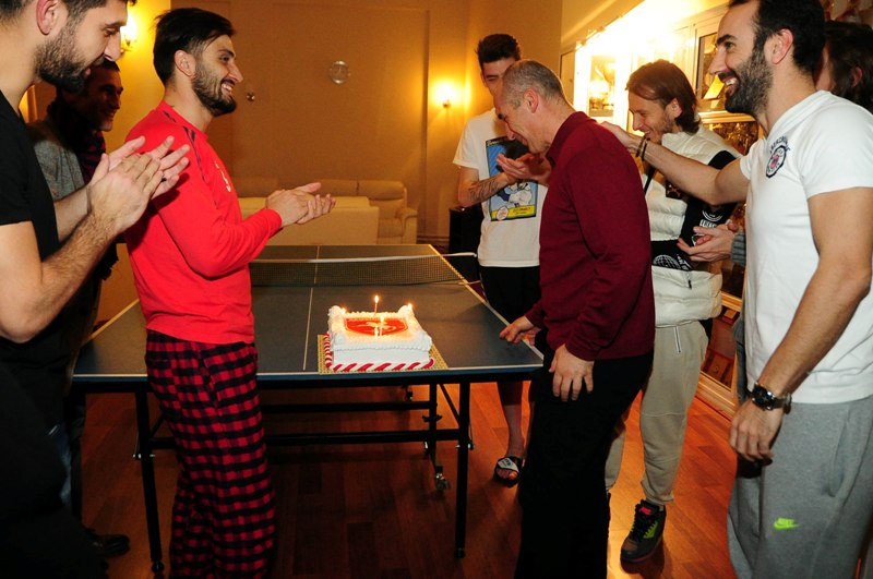 Nuri Asan Tesisleri'nin oyun salonunda doğum günü pastasını karşısında gören Kırmızı-beyazlı-siyahlı ekibin antrenörü Yunus Şenocak mutluluğunu oyuncular ve teknik ekiple paylaştı ve yaş pastayı kestikten sonra tek tek tebrikleri kabul etti.