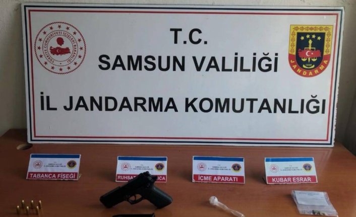 Durdurulan bir araçta ve araçta bulunan E.B. ve K.A'nin üzerinde yapılan aramada ruhsatsız tabanca, 6 mermi ile bir miktar esrar ele geçirildi.