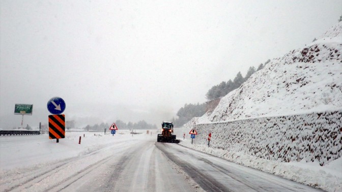 Kar yağışının etkili olduğu Çamlıbel Geçidi'nde Karayolları ekipleri, kar küreme ve tuzlama çalışması yaptı. Kent çıkısında da trafik polislerince geçişine izin verilmeyen tır türü araçlar bekletiliyor.