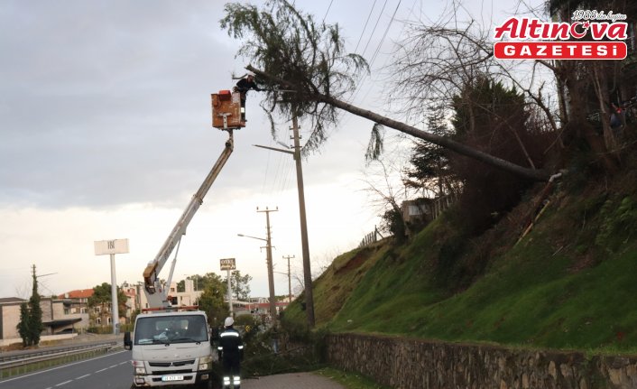 Gölevi Mahallesi'nde rüzgarın etkisiyle kökünden sökülerek devrilen ağaç, elektrik tellerinin üzerine düştü.