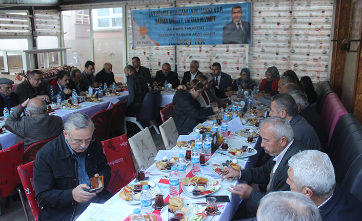 Kudret Tek yaptığı açıklamada “Bizim Adaylığımız Yakanet`te işlerin kötü gittiği değil aksine bir tık daha yukarı nasıl geliştiririz uluslarası projeleri nasıl şehrimize getiririzi projelendirerek adaylığımızı açıklıyoruz. Bizim sloganımız belli önce hizmet sonra siyaset prensibi ile yola çıkacağız. Dolayısıyla bugüne kadar mevcut olan kavgaları bitireceğiz. Eğer bir yerde kargaşa değilde bir bütünlük varsa oarada en iyi şekilde halka hizmet vardır. Biz bölgemize bir gölet yapmayı düşünüyoruz. Biz daha öncede bu projeyi önerdik. Fakat bu projenin çok büyük olduğunu söylediler. Bizde diyoruz ki büyük insanlar büyük düşünür. Küçük insanlar küçük düşünür. Bununla ilgili yatırımcılarımızla görüşmelerimiz sürüyor. Nasıl yapacağımız A`dan Z`ye belli. Bölge turizmine katkı sağlayacak bir proje. Ekonomiye ciddi katkı sağlayacak. Emsalimizde Uzun Göl’dür. Bizim göletimiz onun 3 katı daha büyük olacak. Yaşlı yaşam merkezlerimizi kurarak büyüklerimize hizmetler edeceğiz. Bize toprağın verdiğini biz pazarlayamıyoruz. Bu konu hakkında da ciddi çalışmalarımız var. İstihdam alanlarında çok iddialıyız. Tekstil alanı ve montaj sanayi alanlarında istihdam konusunu ilçemizde hayata geticeğiz. İlk yılda bin kişiyi istihdam ettireceğiz. İlçemiz bundan sonra göç vermeyecek. Gurbet hasreti çekmeyecek aileler. Göç alan ilçe haline getireceğiz. 5 yıl boyunca sadece çöpü döküp yolları süpürüp beton döküp geleceğimize katkı sağlayamayacaksak aday olmamıza gerek yok dedik. Allah katında hesabını ödeyemeyeceğimiz hiçbir işin altına girmeyiz. Aday Adaylığımız ilçemize, partimize, vatandaşımıza ve bizlere hayırlı olsun” dedi.